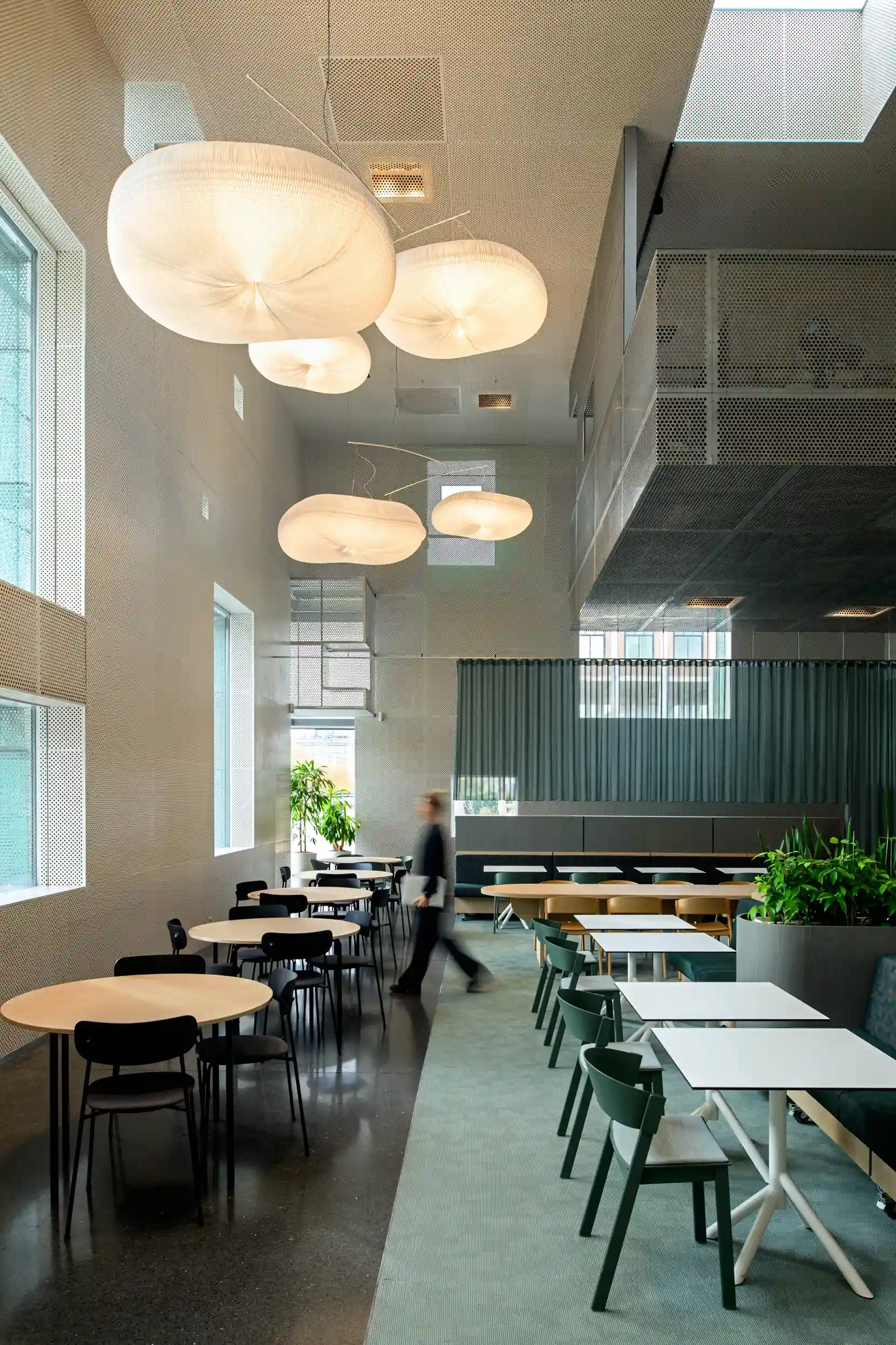 Het bijzondere aan deze lamp is dat het materiaal — een luchtige honingraatstructuur van niet-geweven polyethyleen — licht uitstraalt en tegelijkertijd geluid absorbeert. Dit geeft niet alleen sfeervolle verlichting maar helpt ook om de akoestiek in een ruimte te verbeteren door galm te verminderen. Hoewel het de verfijnde uitstraling heeft van een papieren lampenkap, is het materiaal scheur- en waterbestendig, stofafstotend en eenvoudig schoon te maken.